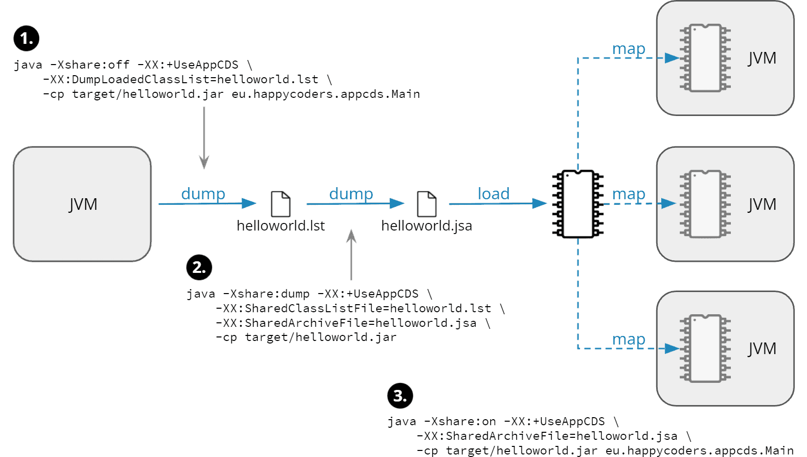 AppCDS allows the class loaders, garbage collectors, and custom loaders to load the archived pre-processed data. On the application launch, the shared CDS archive is visited and leveraged for bootstrapping, if not found then on application exit the archive will be created with the list of classes that were used to load the application.